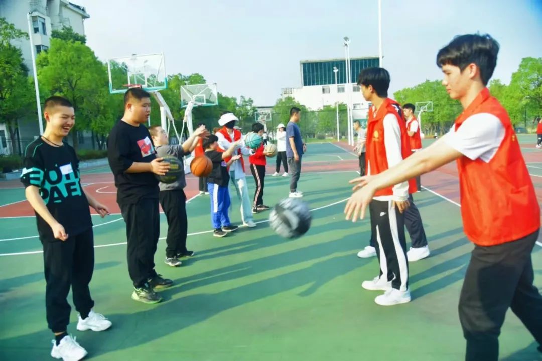 活动伊始,参与者们被分成两个一组,相互间进行了充满热情的自我介绍。每个人都洋溢着期待的笑容,展示出对此次活动的热切盼望。自我介绍完毕,大家旋即投入三圈的热身运动中,以此为自己接下来的出色表现做好充分准备。热身环节过后,众人神采奕奕,斗志高昂。随即,各组的志愿者开始传授拍球的技巧,紧接着,大家便开始了自由练习。10分钟过去,比赛正式开始,各组配合默契,篮球在空中划出一道又一道优美的弧线。在传球的过程中,志愿者们总是不吝啬地献上掌声,既让他们体验到成功的喜悦,也增强了他们面对未来挑战的自信。