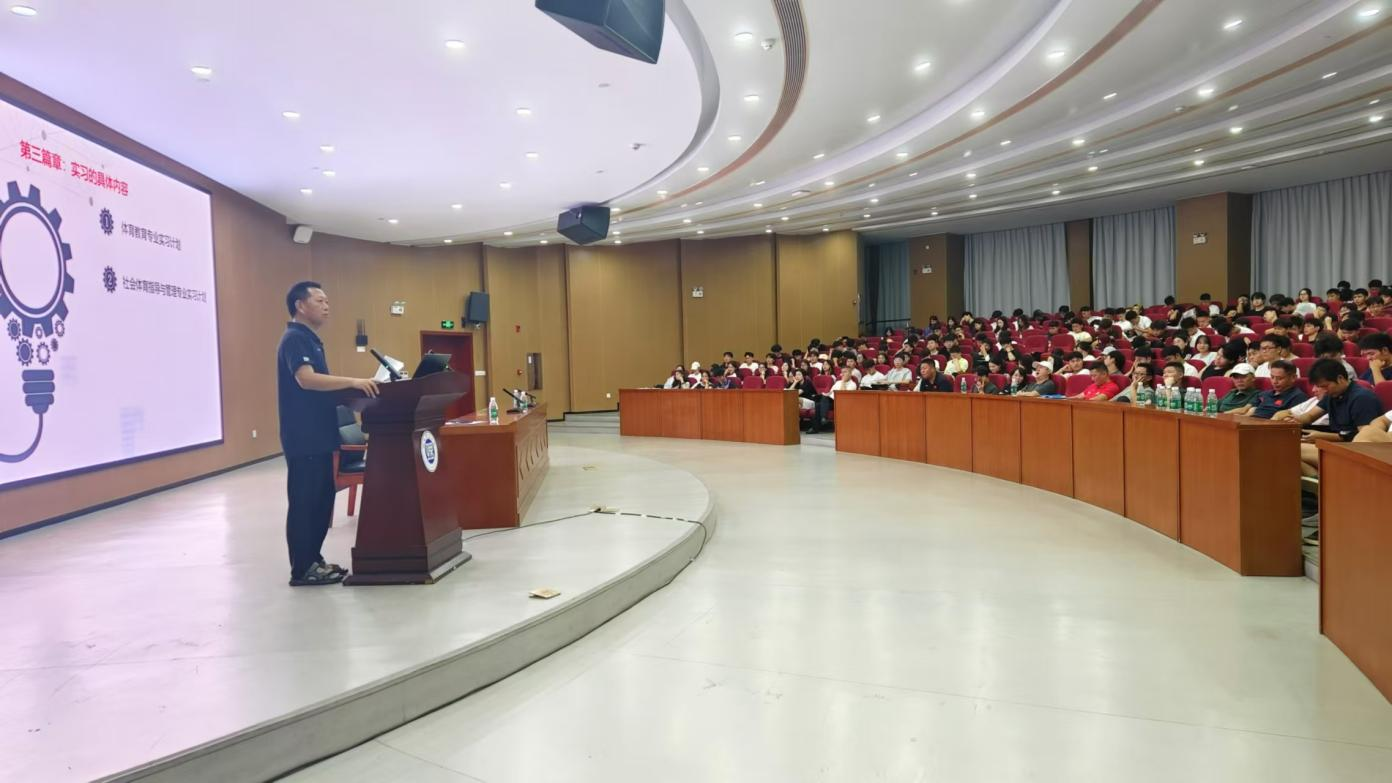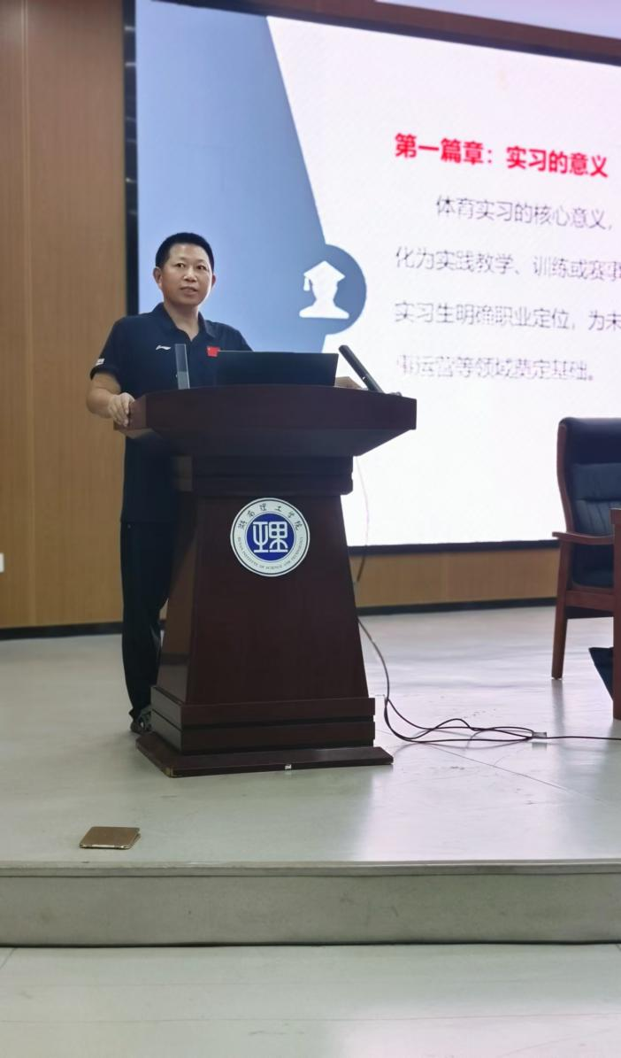 会上,张一龙副经理详细解读实习工作。他从 “实习的意义”“实习的目的”“实习的具体内容”“实习生守则” 四大篇章展开,强调实习核心是推动理论转化为实践能力、明确职业定位,目的是巩固专业知识、提升教学能力并树立奉献体育教育的信念。张一龙还介绍了体育教育、社会体育指导与管理专业的专属实习计划,重申 “一准则两红线” ,强调实习纪律要求,他还分享往届实习生 “累 — 乐 — 泪” 的经历,勉励毕业班同学们积极参加实习工作。