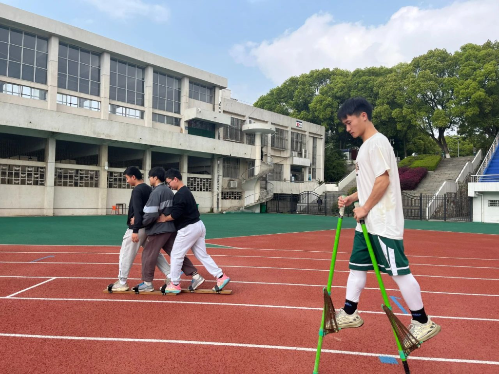此时跑道上,覃俊及两名队友正将各自的双脚套在同一双板鞋上,三人一板,人板合一,在奋力向前奔跑的同时,也考验着三人的默契和协调。倏地一下,步调被打乱,三人齐倒在地上。很快,三人再一次穿好板鞋,重新站起来。“板鞋竞速既考验个人身体素质,又需要团队间的交流,跌倒再重来,才能获得进步与突破。”覃俊暗暗打气道,随后起身复盘,统一步调,在不知不觉中,三人配合愈入佳境。