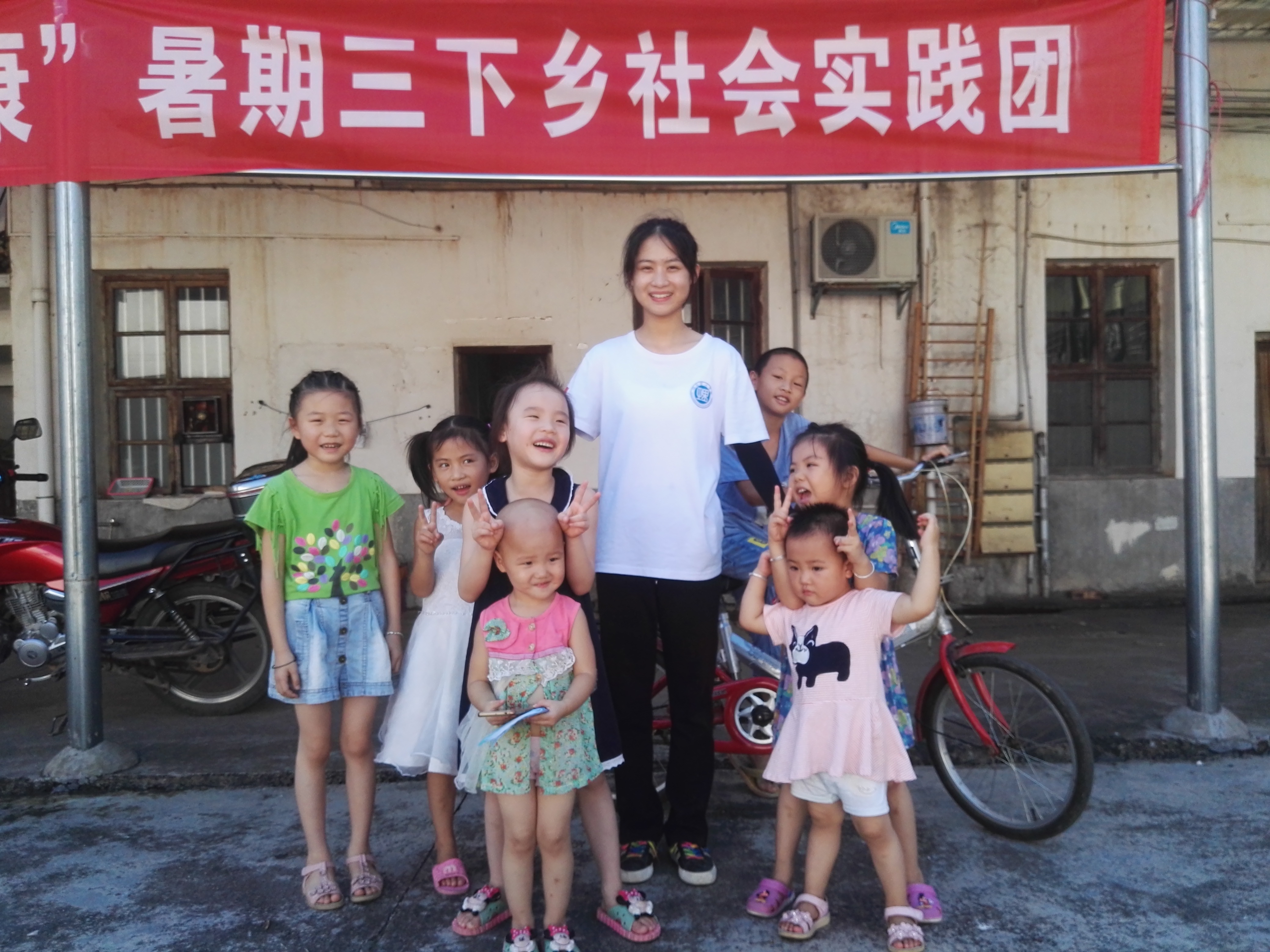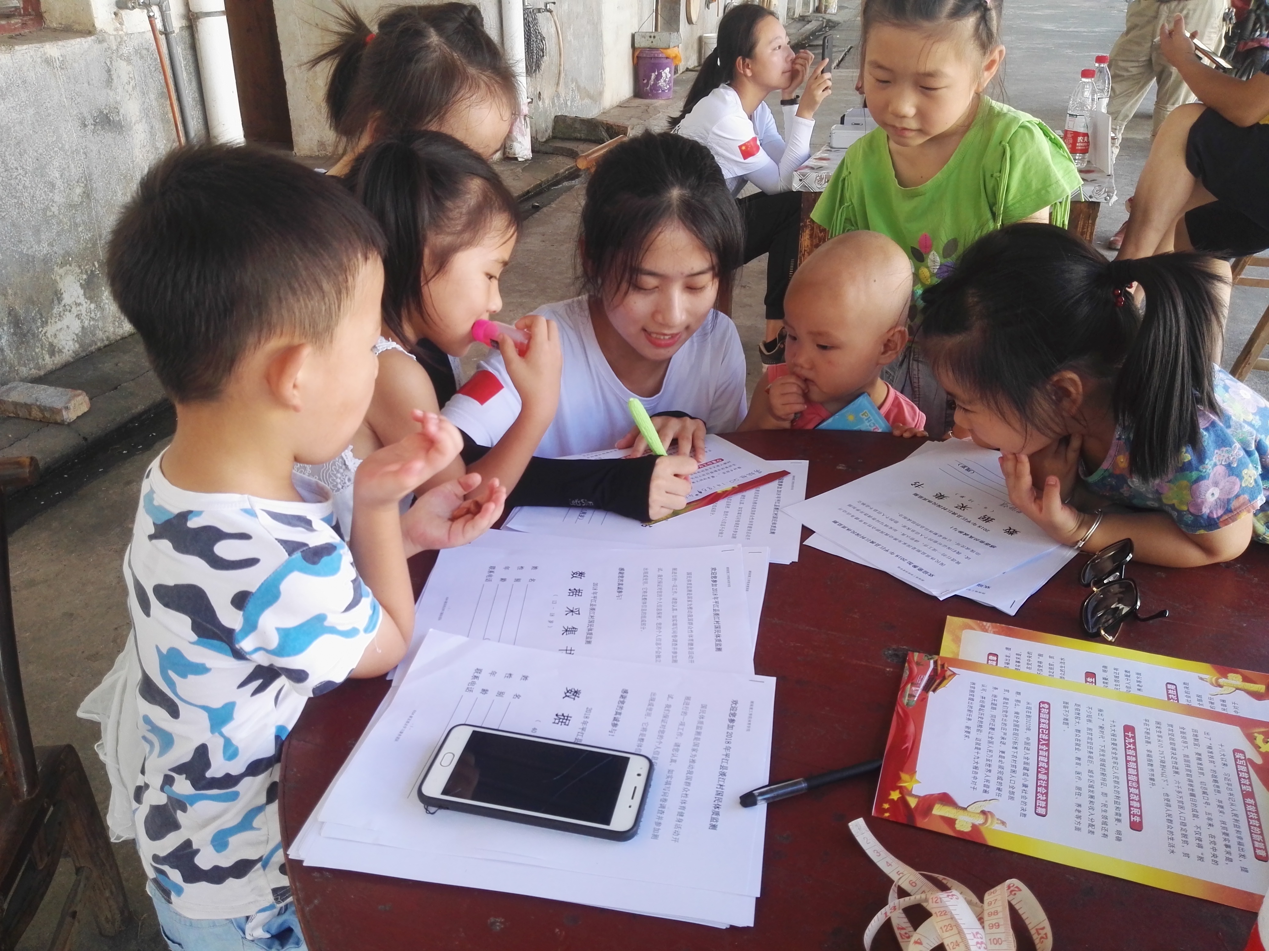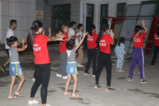 结束了一天的团队工作,拖着疲惫的身体回到驻地,猛灌了几口水,急匆匆地扒了几口饭,604学理论示范寝室理论宣讲服务团成员王芳和王莹澳又拿起背包,迎着晚霞出门了,她们将要尽快的赶去村部,那里,还有一群小朋友在等着她们。