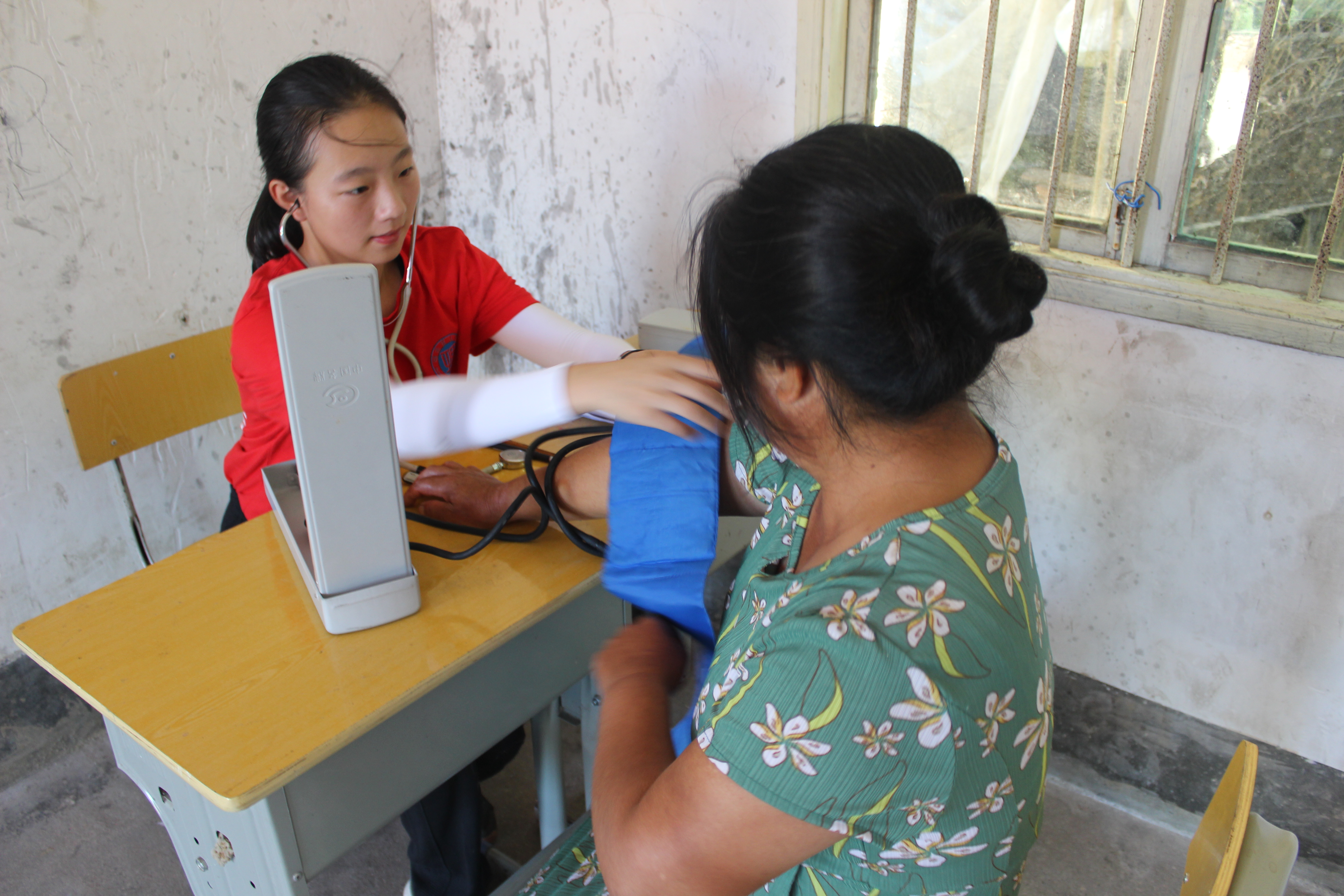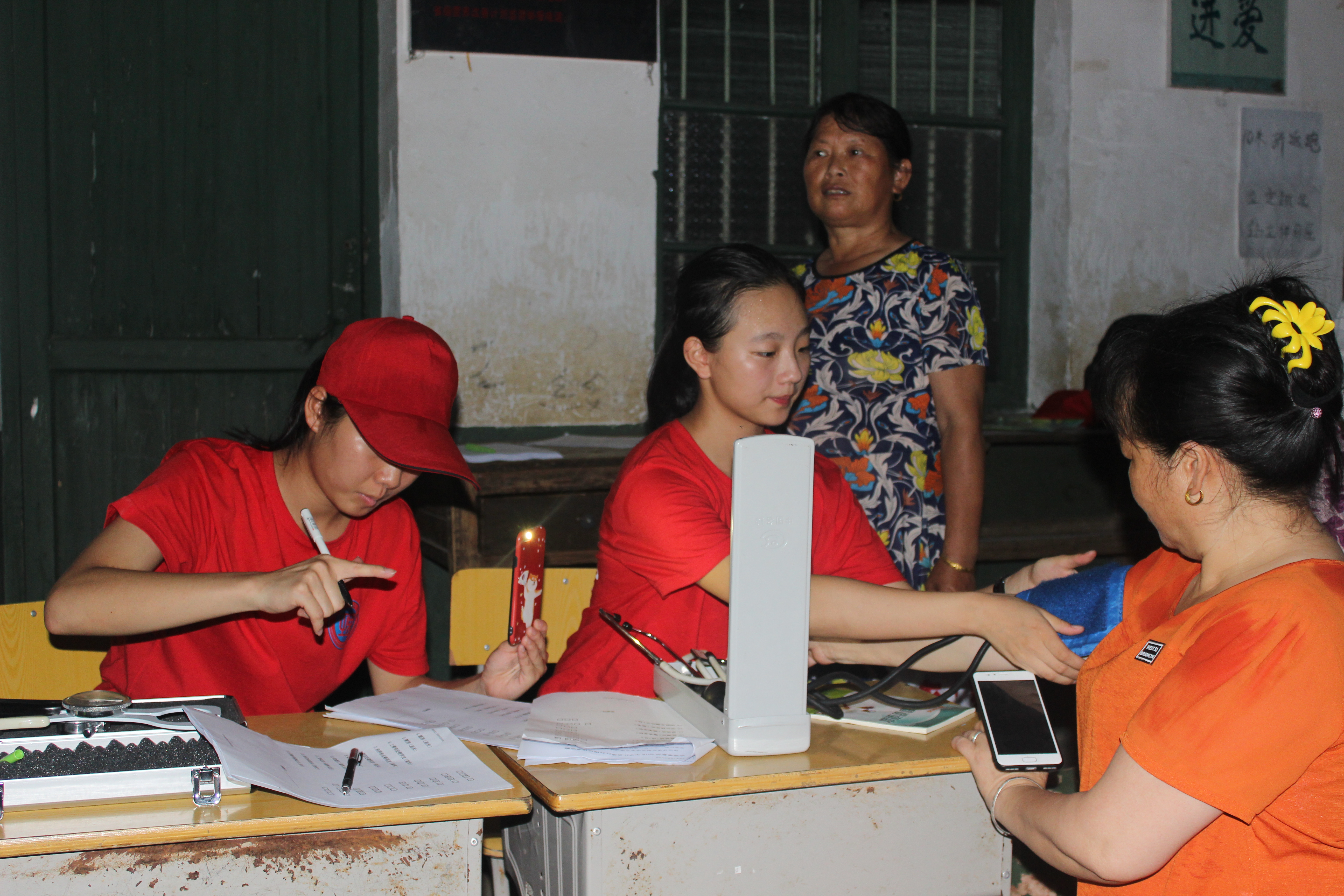 “嗲嗲,天气太热了,您先喝点水,在旁边休息一下,等一下我们就会给您量血压的......”604学理论示范寝室成员旷景沂亲切的接待冒着酷暑,前来淡江村村部进行国民体质监测的刘胜强爷爷。