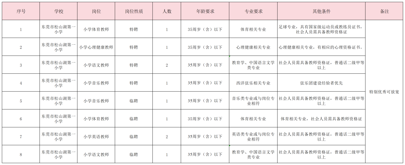 4.放宽条件符合东莞市公开引进基础教育高层次人才和短缺专业人才的相关规定的报考人员,可适当放宽学历、年龄要求,具体放宽条件参考东莞市公开引进基础教育高层次人才和短缺专业人才的相关规定。择优考虑。