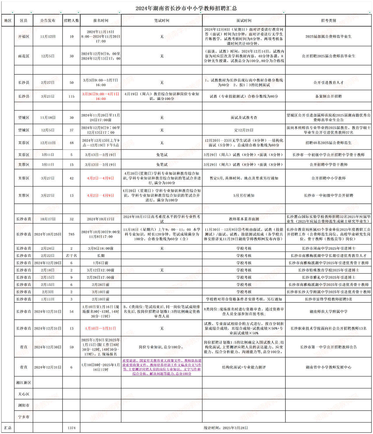 2025年长沙市公开招聘教师人数已达1888名2025年长沙市教师招聘人数达到1374名(部分招聘是2024年12月发布的)。其中长沙市直914名,省直事业单位教师岗65名,芙蓉区123名(部分即将报名),望城区67名,长沙县165名(部分正在报名),雨花区210名,开福区10名,湘江新区7名;根据已经发布的招聘信息分析,招聘的岗位主要是面向公费生,应届毕业生(研究生),师范生,骨干教师招聘;面向社会公开招聘教师目前仅芙蓉区(42名)和长沙县(115名),雨花区180名。尚未发布教师招聘公告区市:湘江新区,天心区、浏阳市,宁乡市
