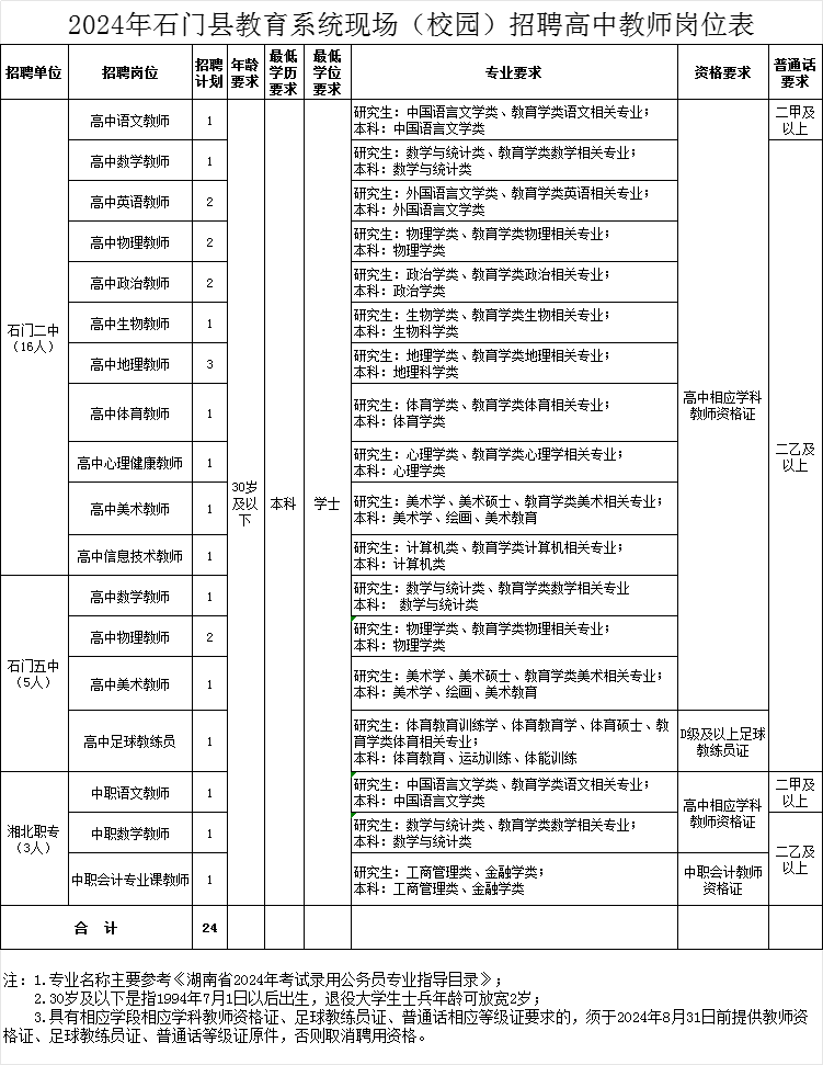 共招聘高中、中职教师24名,本次招聘教师均纳入全额拨款事业编制。其中石门二中16名,石门五中5名,湘北职专3名。