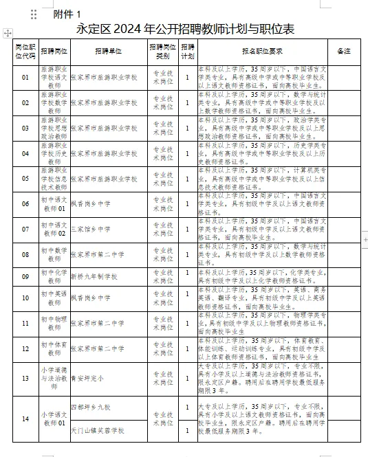 根据《事业单位人事管理条例》(中华人民共和国国务院令第652号)、《事业单位公开招聘人员暂行规定》(人事部令第6号)、《关于进一步做好艰苦边远地区县乡事业单位公开招聘工作的通知》(人社部规〔2016〕3号)和《湖南省事业单位公开招聘人员办法》(湘人社发〔2019〕1号)等有关规定,永定区2024年决定面向社会公开招聘部分中职、初中、小学专业课教师及幼儿园教师。现将有关事项公告如下: