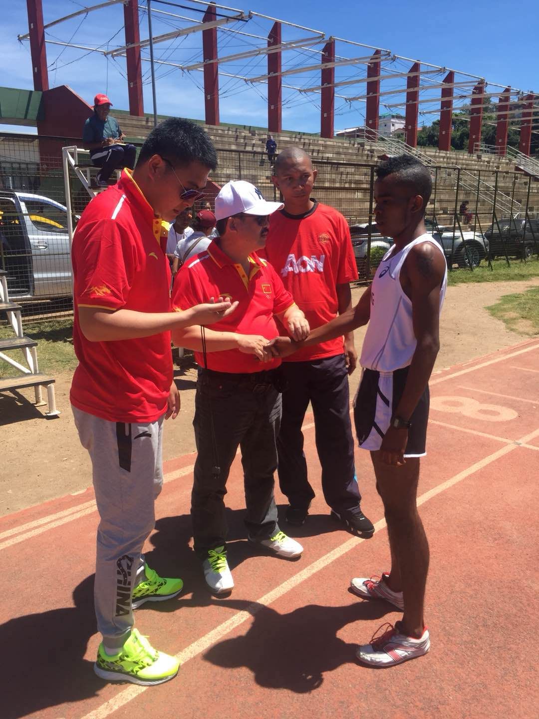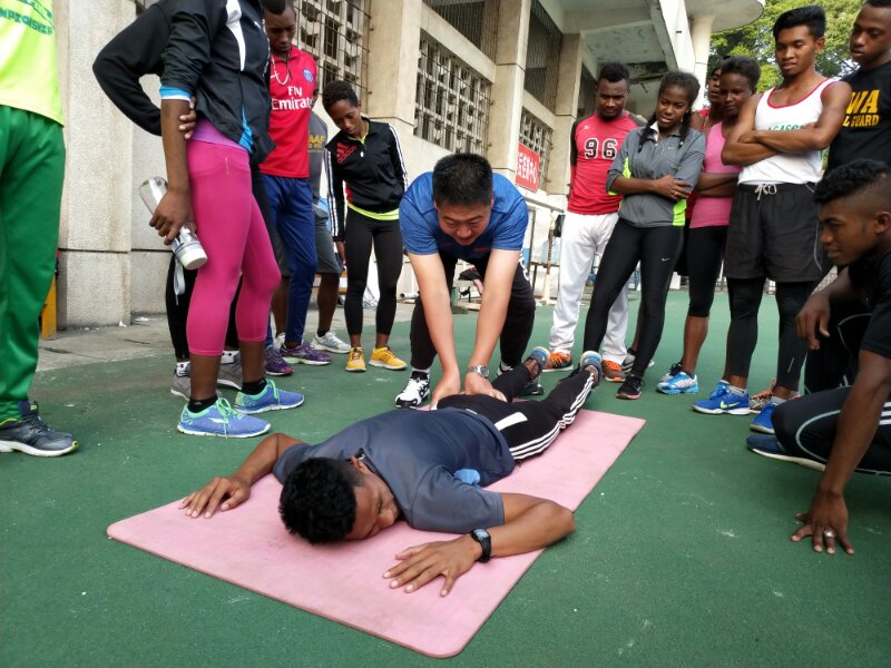 1500M训练时,马达加斯加田径队运动员多内在终点冲刺时,突然摔倒,张可同志立即冲过去,检查伤情,发现其右踝外侧扭伤,痛苦不堪,张可要翻译找冰块的同时,开始了现场紧急处理,按压、施药等一系列应急处理措施得心应手,待其受伤情况稳定后,张可又告知多内如何进行下一阶段康复治疗的注意事项,在场的马国教练竖起大拇指连连称赞。
